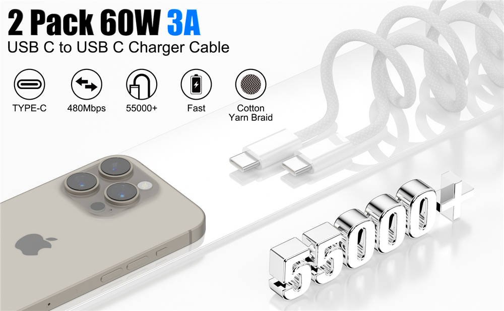 【60W Fast Charging】60W USB C a USB C Cable para iPhone 17/16/15 pro soporte PD3.0/QC3.0/QC4.0 carga rápida hasta 60W Max (20V/3A) con adaptadores de suministro de energía USB-C como 30W/45W/60W.Carga teléfonos USB-C de 0% a 80% en 35 minutos, con velocidades de transferencia de datos de hasta 480Mbps.