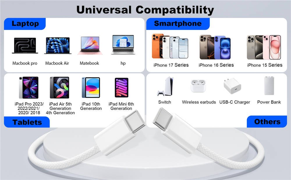 【Universal Compatibility】Funciona a la perfección como cable de carga de iPhone 16 17, cable de carga de iPhone 15 y más allá, incluidos iPhone 17/16/15 Pro/Max/Plus, Google Pixel, MacBook Pro/Air M2 y iPad Pro/Air/Mini. Una verdadera solución USB C a USB C para todos los dispositivos USB-C de carga rápida.
