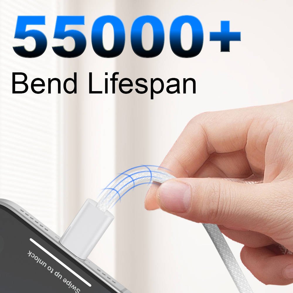 【Longer Lifespan】El cable USB C a USB C cuenta con un exterior trenzado de TPE y nailon y un núcleo de fibra a prueba de balas para sobrevivir a más de 55 000 curvas. Los avanzados conectores soldados por láser, los núcleos de cobre reforzados con UV y el puerto USB-C con una carga de 20 kg garantizan que este cable C a C dure más que los cables de carga estándar.