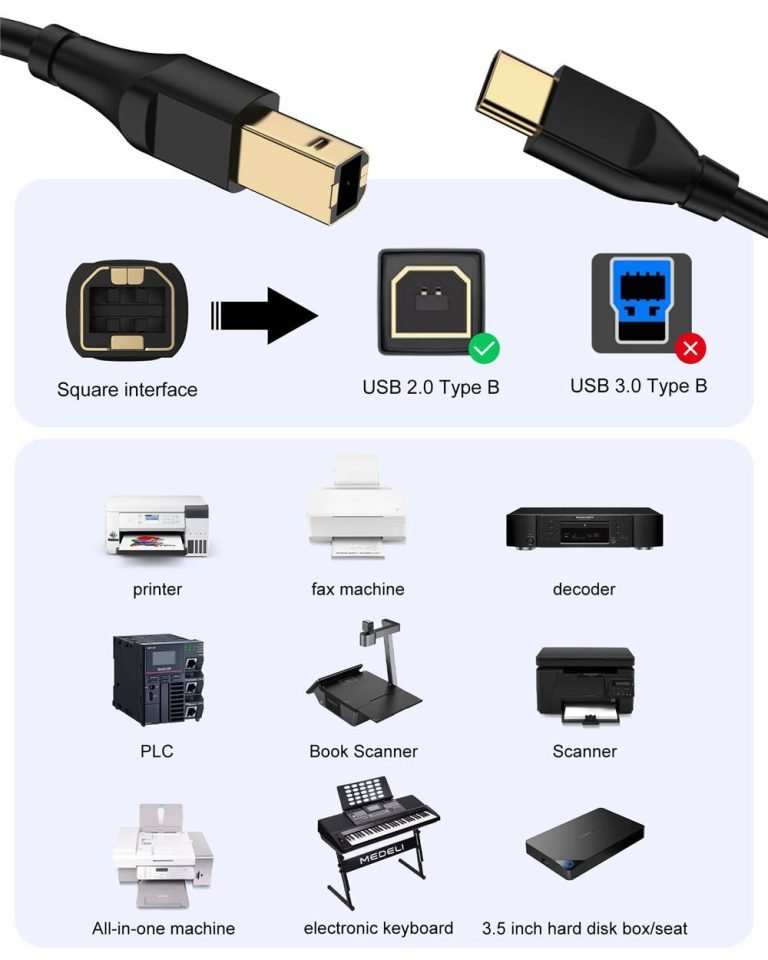 Compatibilidad universal: El cable de impresora USB 2.0 es compatible con una amplia gama de dispositivos, como impresoras, escáneres, servidores, discos duros, cámaras, pianos electrónicos, teclados MIDI, micrófonos, decodificadores DAC y otros periféricos que utilicen un puerto USB B. Se conecta fácilmente a portátiles, ordenadores, PC u otros dispositivos con USB para transferir datos.