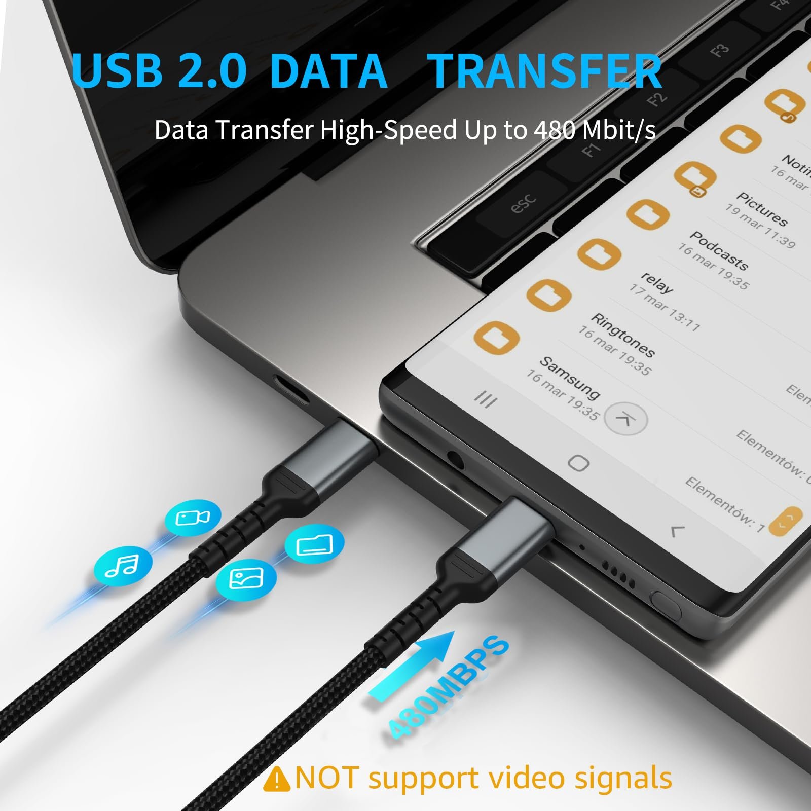 USB-C 2.0Ce câble USB C vers C prend en charge une vitesse de transfert de données allant jusqu'à 480 Mbps pour la synchronisation et la charge. Utilise le protocole USB 2.0 pour une compatibilité universelle. Non compatible avec le transfert de signaux vidéo.