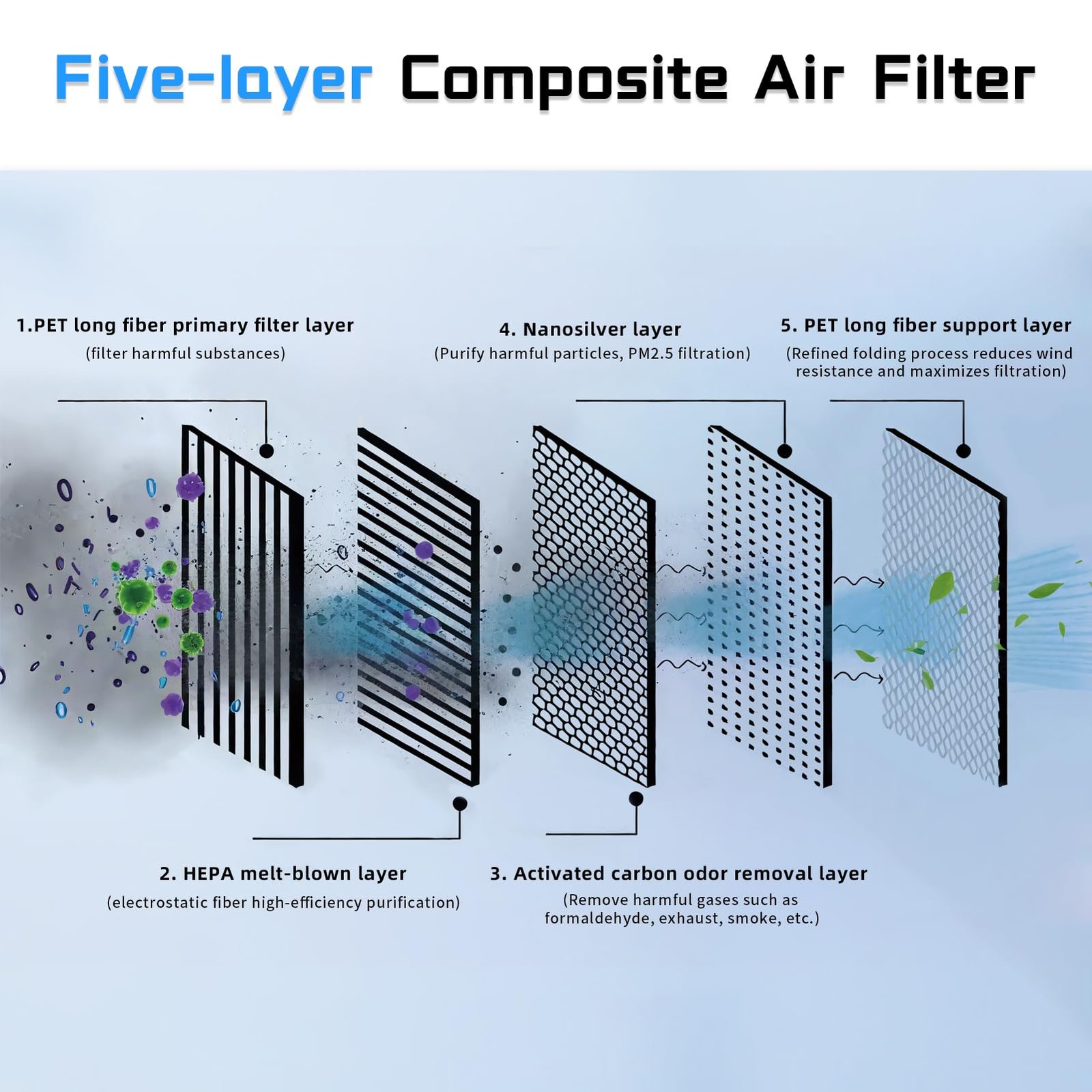 High-quality materials: our external Hepa Air Filter Replacement features a five-layer design that includes PET pre-filter, HEPA melt-blown layer (blocks PM2.5/pollen), activated carbon (removes formaldehyde/exhaust fumes), nano-silver coating and PET support layer with folded design