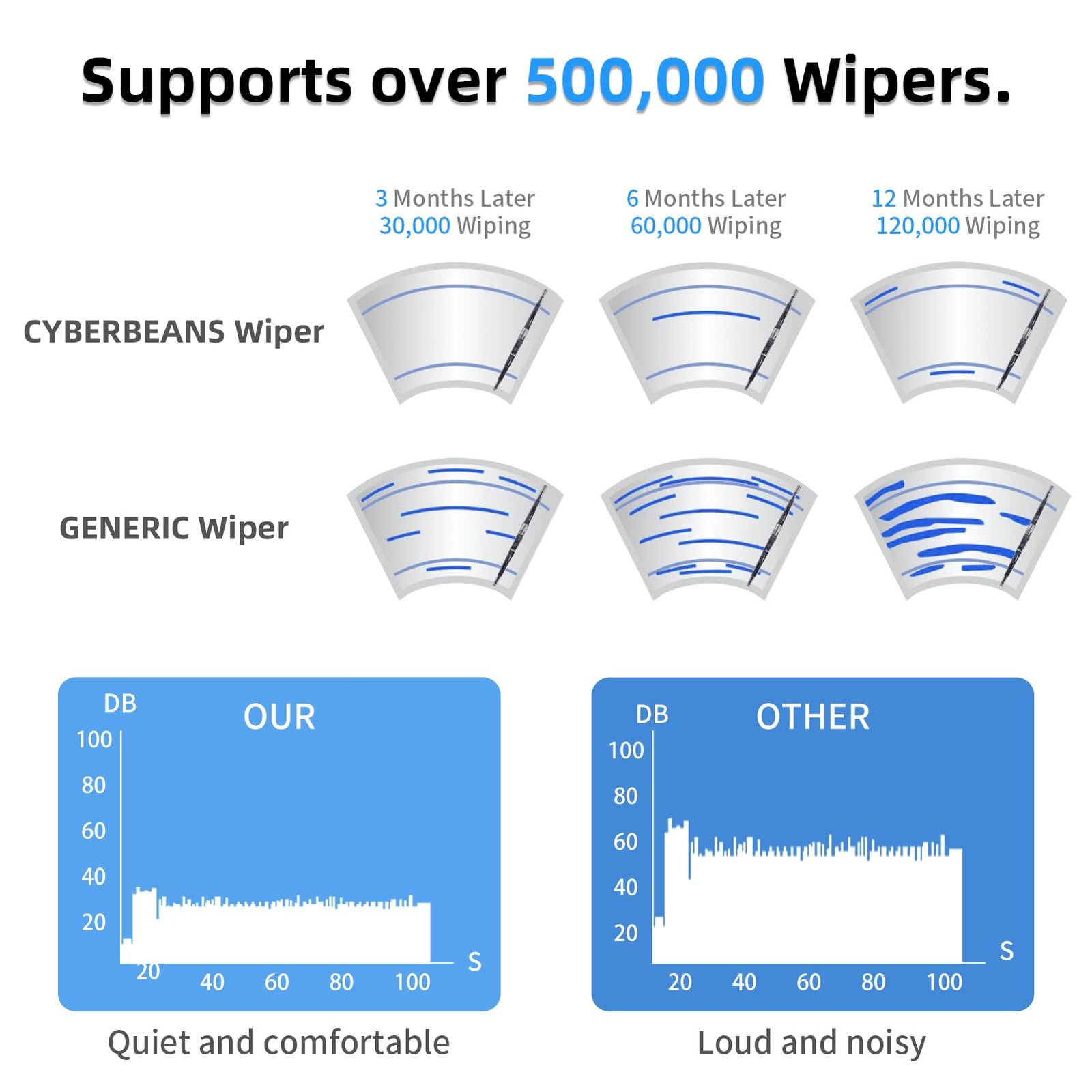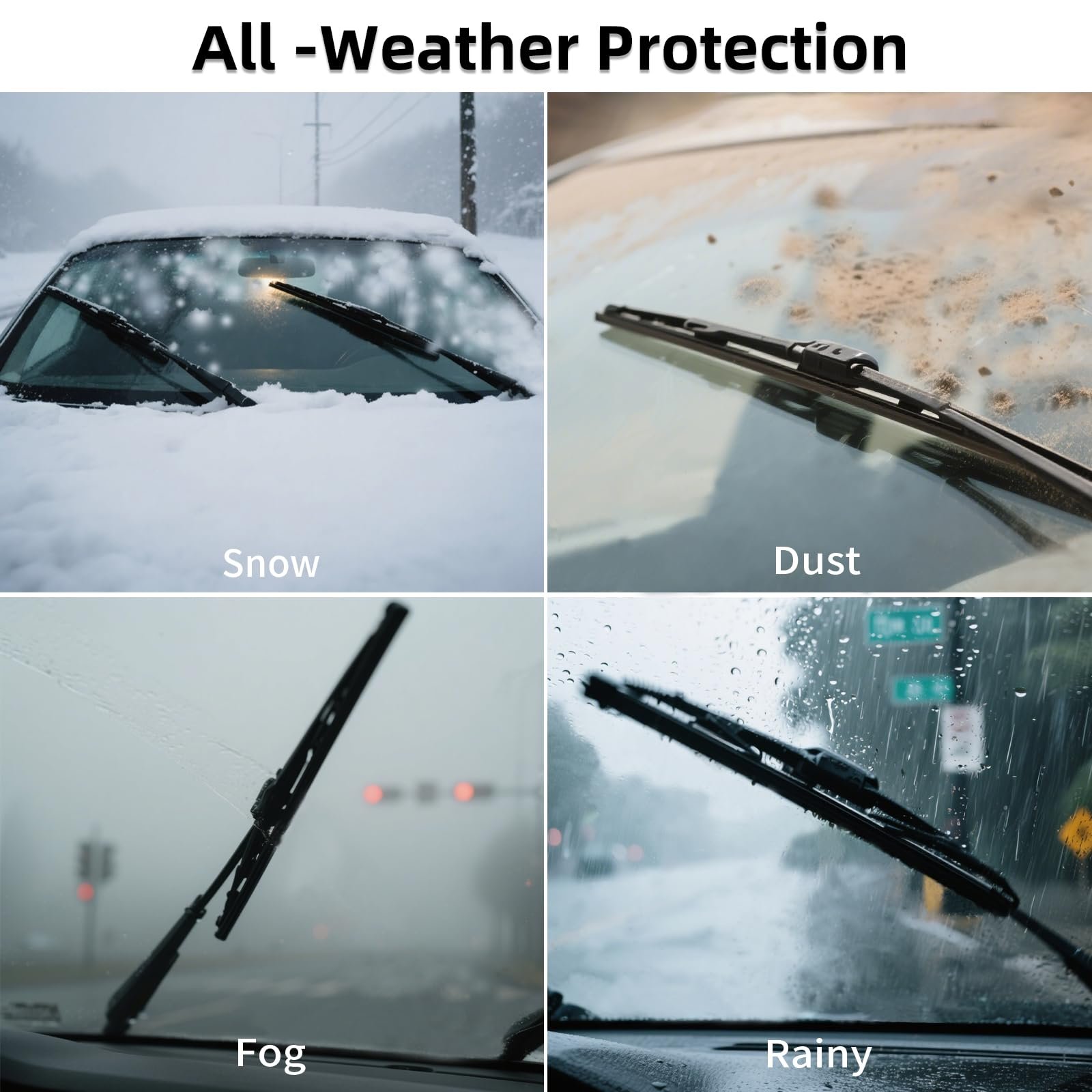 Asymmetric wind spoiler + Extended Tab Protector: Aerodynamic curved design reduces wind noise and maintains stability.Extended Tab Protector​ wiper joints from debris and metal wear